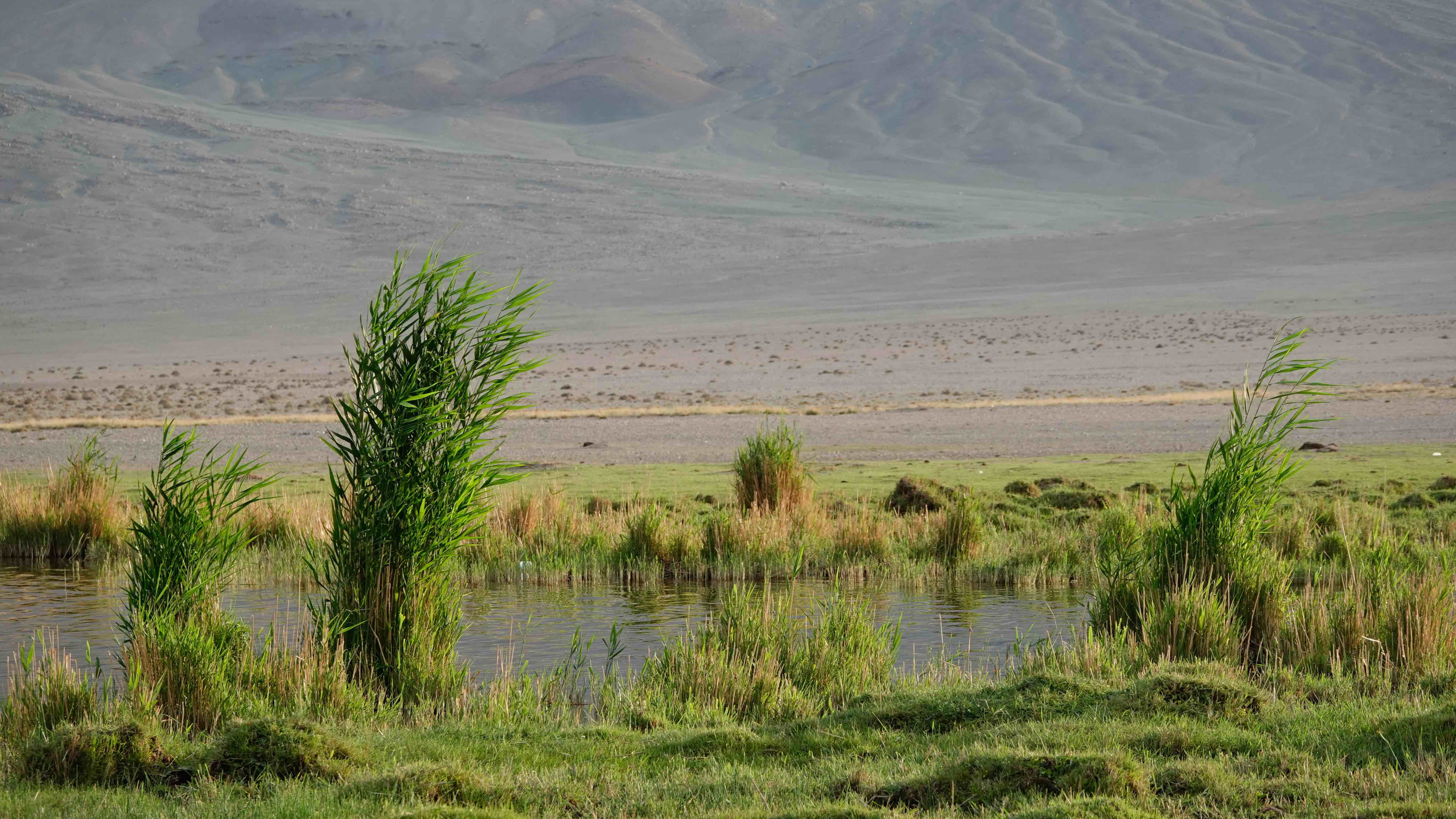 Auf der Fahrt aus dem Dorf heraus müssen wir den Fluss auf eine Brücke überqueren und stellen fest, dass wir unter der Höhenbegrenzung nicht durchpassen… Etwas ratlos stehen wir davor und überlegen, wo wir am besten unterhalb der Brücke durch den Fluss fahren können. Anscheinend sind wir beobachtet worden und es kommt ein Auto angebraust, dessen Fahrer für uns die Schranke aufschließt – gegen eine kleine Gebühr ;). Wir fahren eine ganze Weile an dem Fluss entlang, an dessen Ufer sattes grünes Gras wächst und Pferde weiden. Eine Wohltat nach so viel Wüste!