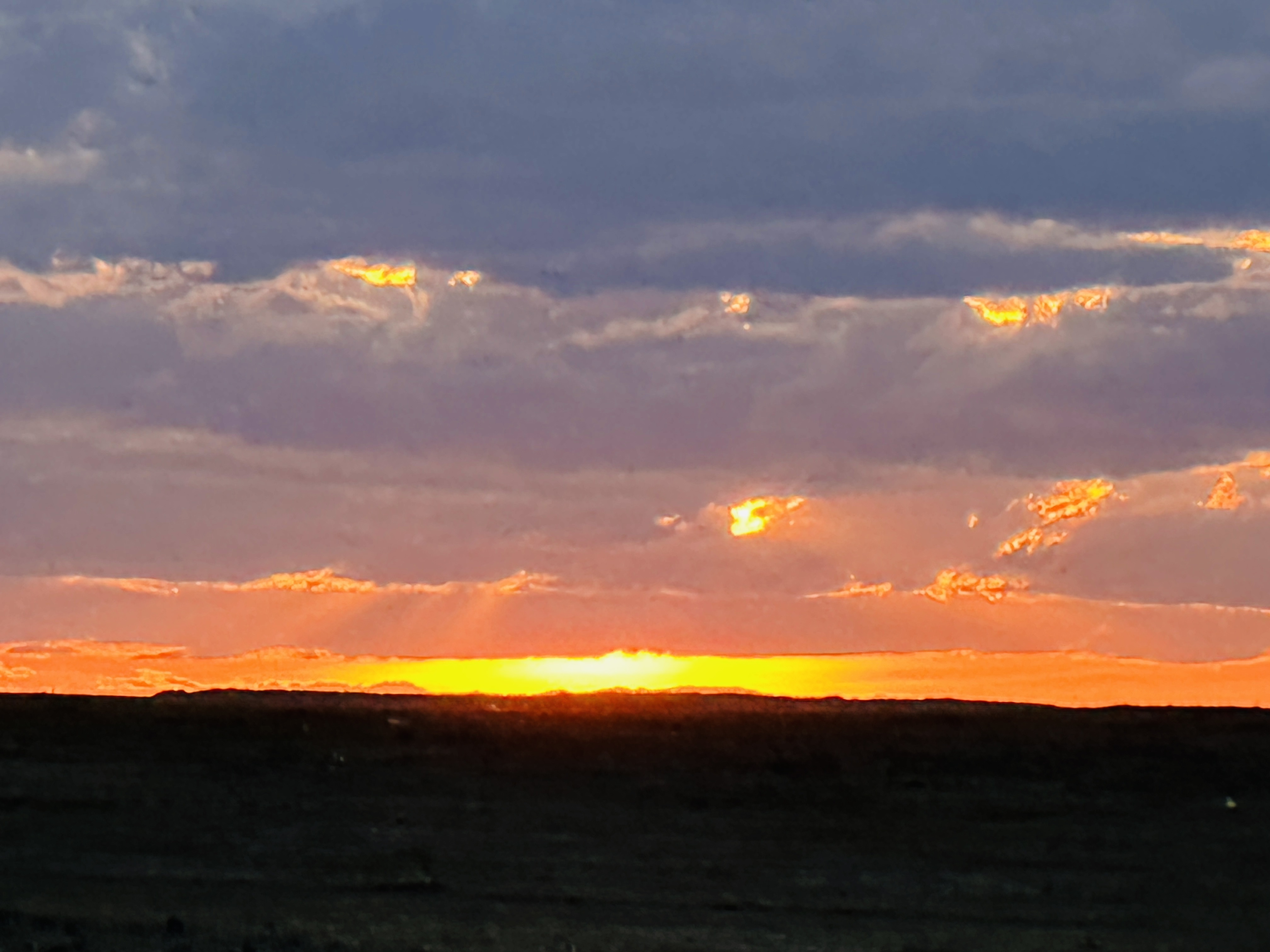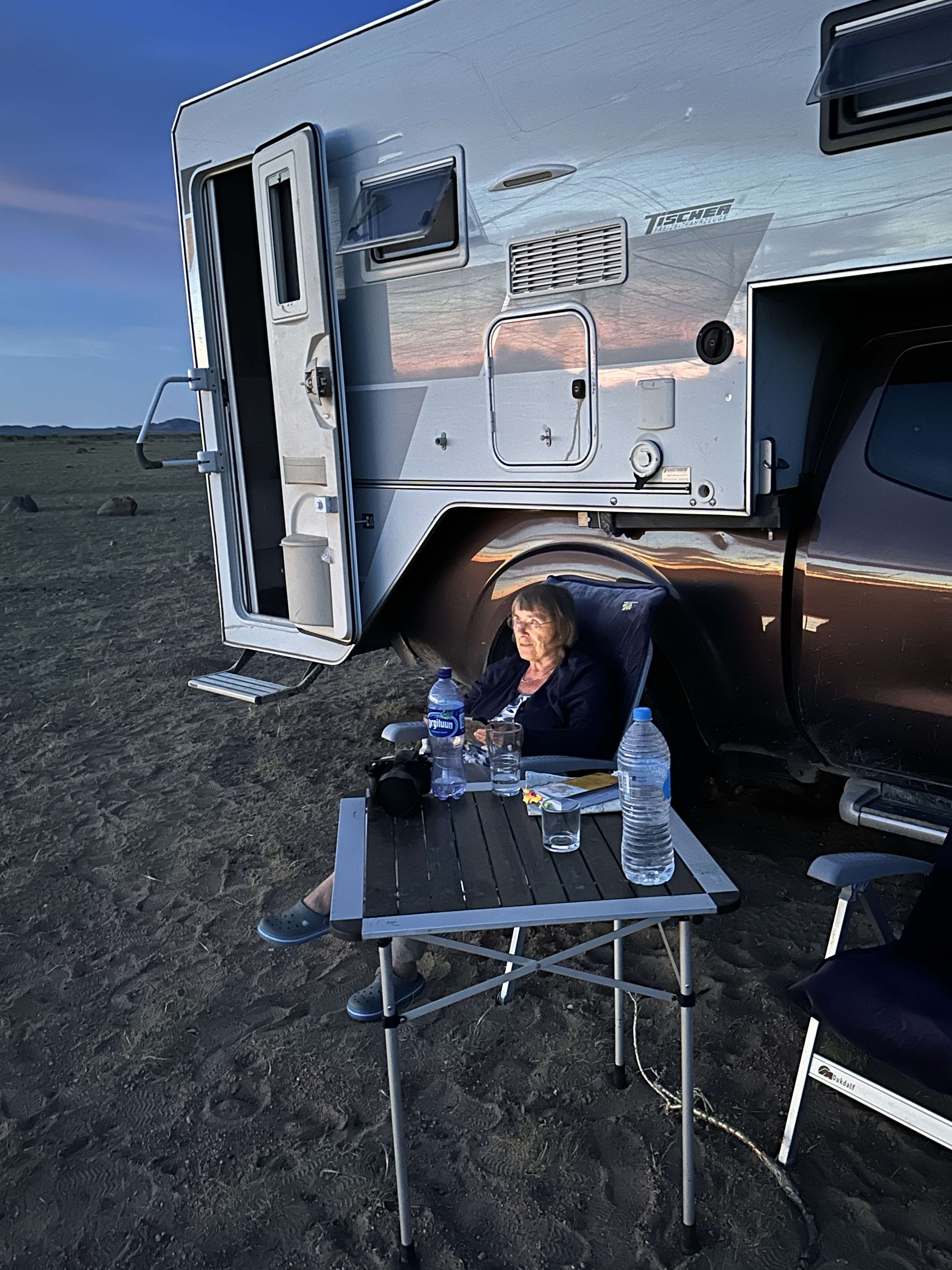 Unser Tagesziel sind die „Flaming Cliffs“ und es stellt sich heraus, dass das Gebiet großflächig abgesperrt ist. Wir fahren endlos lang. An der Absperrung entlang, bis wir endlich den Eingang erreichen. Der Eintritt ist moderat und wir finden einen schönen Platz an den Klippen. In diesem Gebiet wurden viele Saurierknochen gefunden und es sollen immer mal wieder welche am Wegesrand auftauchen. Wir finden keine und auch den spektakulären Sonnenuntergang, der die Cliffs in flammendes Rot taucht, verpassen wir, da es leider, leider bewölkt ist.