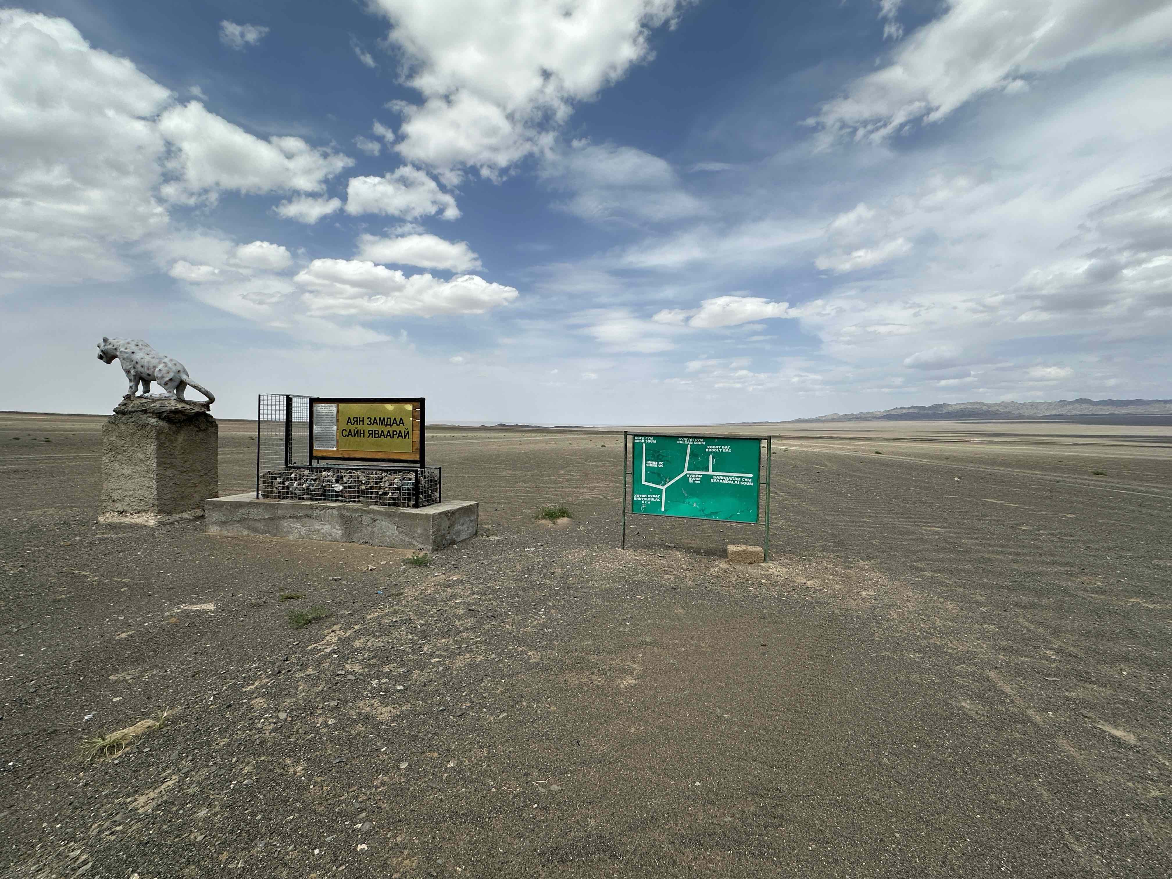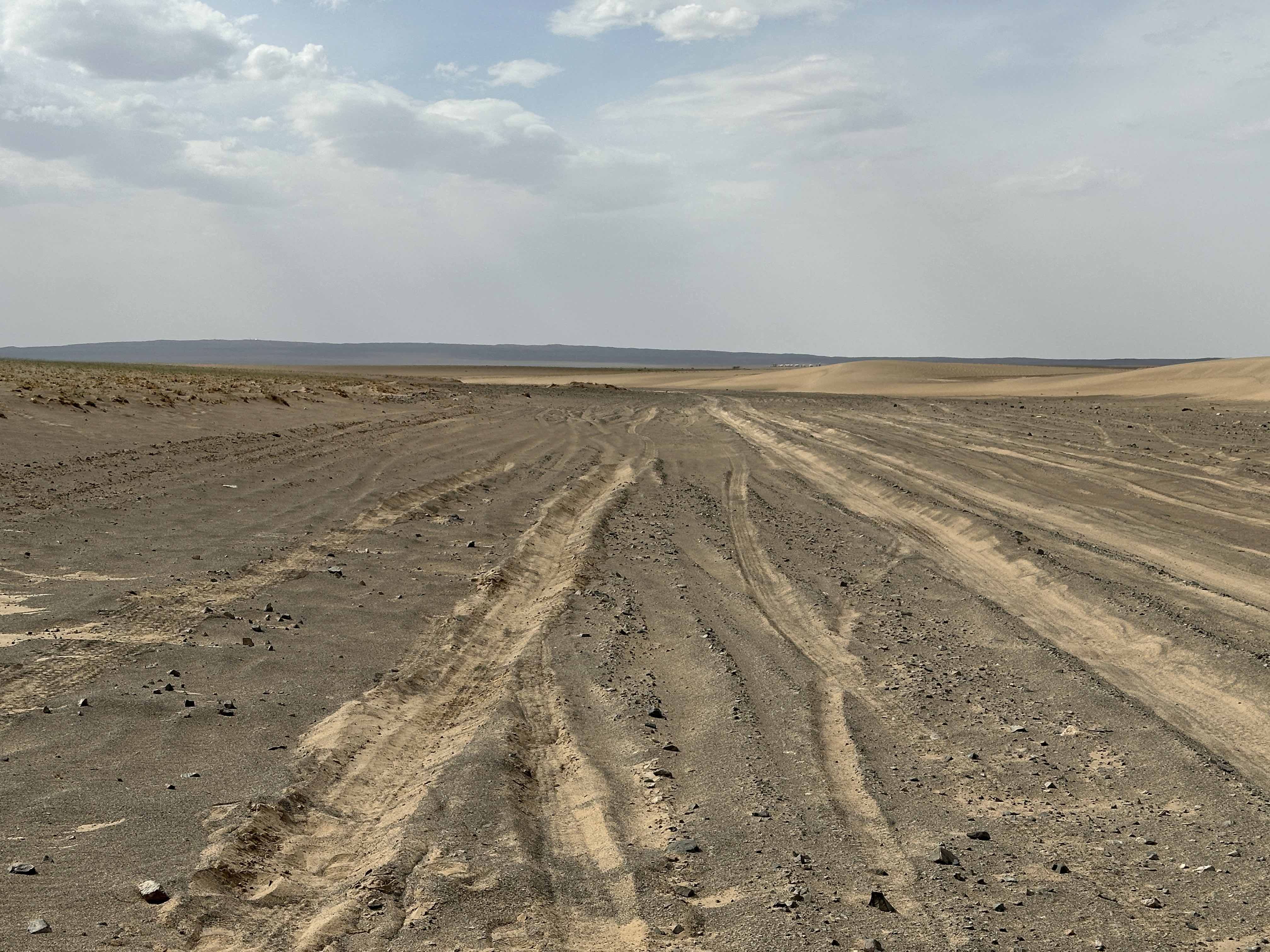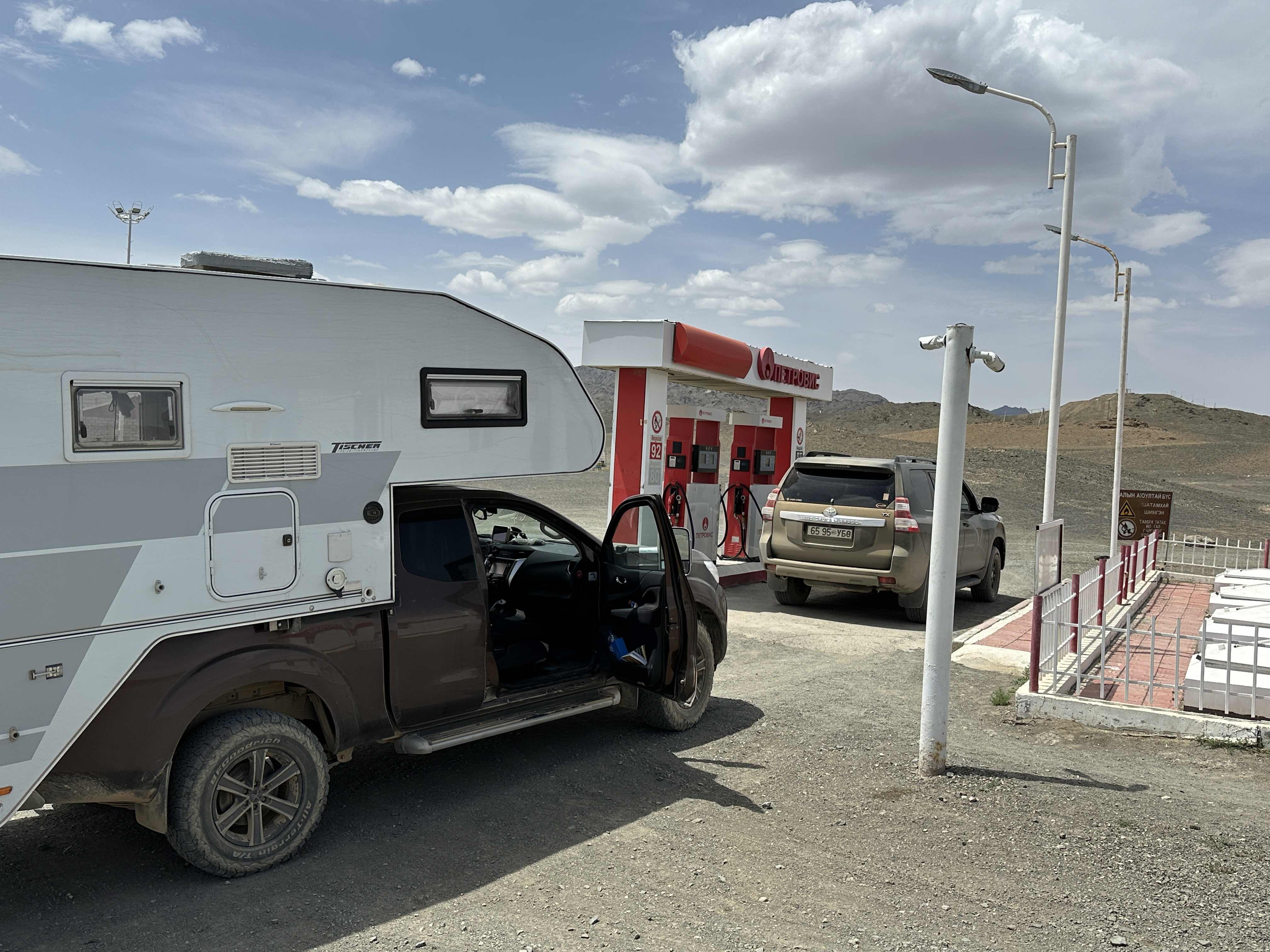 Auf dem Weg zur Khongoryn Els – einer riesigen Wanderdüne in der südlichen Gobi fahren wir zunächst sehr komfortabel auf einer nagelneuen Asphaltstraße. Einige Kilometer nach Bayandalai endet sie unvermittelt an einer riesigen Baustelle und wir müssen auf eine provisorische Piste ausweichen. Der Abzweig nach Sevrey ist nicht zu finden und wir überqueren auf gut Glück die Baustelle und fahren zumindest grob in Richtung der Ortschaft entlang der Stromleitungsmasten. Wir müssen unbedingt tanken und warten geduldig an der Tankstelle, bis der Tankwart von ebenfalls Wartenden herbei telefoniert wird.