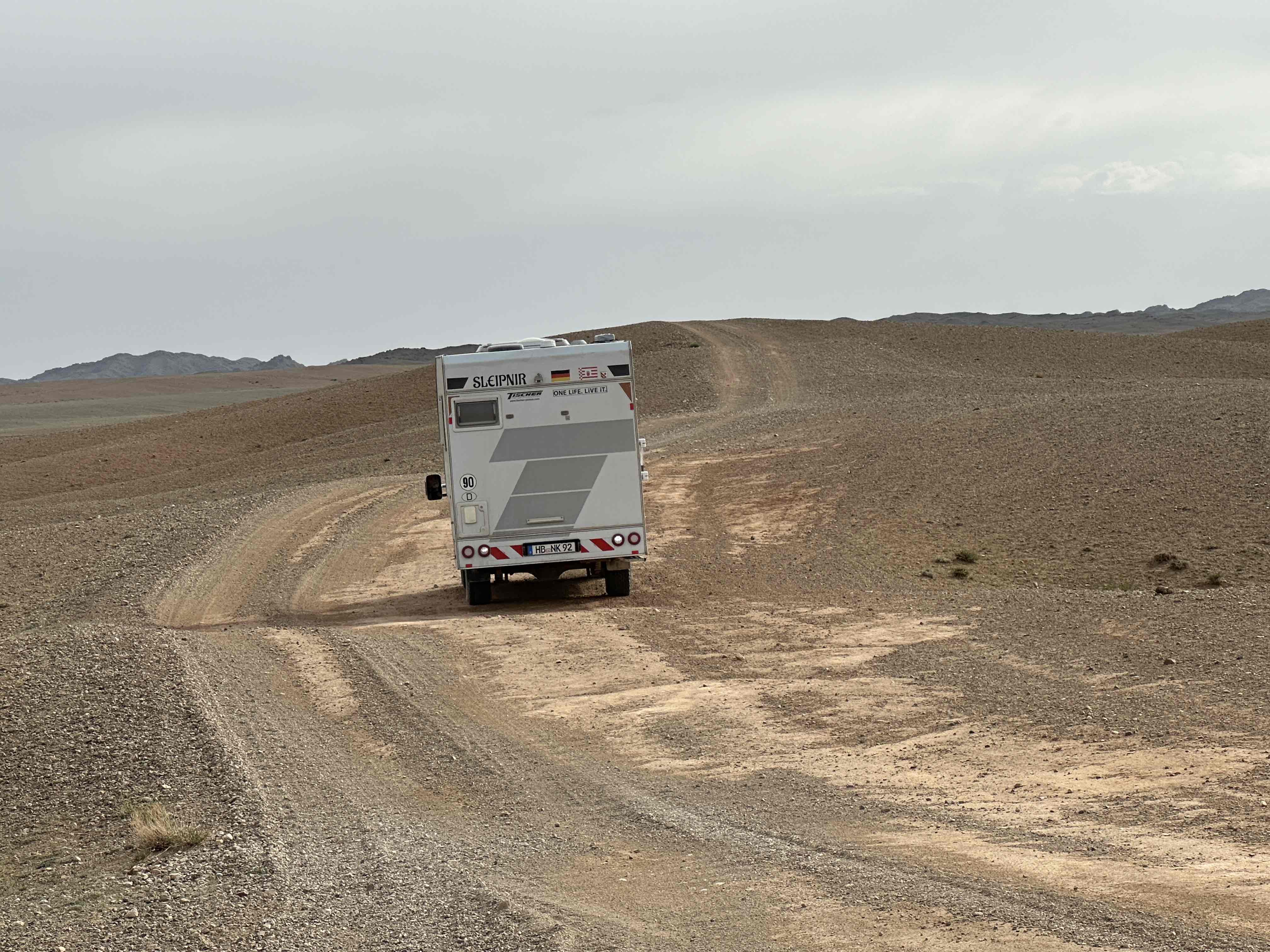 Unser nächstes Ziel ist ein weiteres riesiges Wüstengebiet noch ein Stück weiter im Westen: Mongol Els. Wieder geht es auf unwegsamen Pisten durch die Berge. Erschwerend kommt diesmal hinzu, dass durch Schmelzwasser entstandene tiefe Furchen und steile Abbruchkanten den Weg streckenweise unpassierbar machen. Manchmal reicht es, den Graben mit Steinen aufzufüllen, manchmal müssen wir einen Umweg machen und eine Möglichkeit finden, das Hindernis zu überwinden. Für meinen Geschmack war diese Tour ein wenig zu nervenaufreibend – Walter ist die Ruhe selbst und meistert auch die schwierigen Passagen wie gewohnt sicher und mit großem fahrerischem Können! Mein Held der Piste!!!