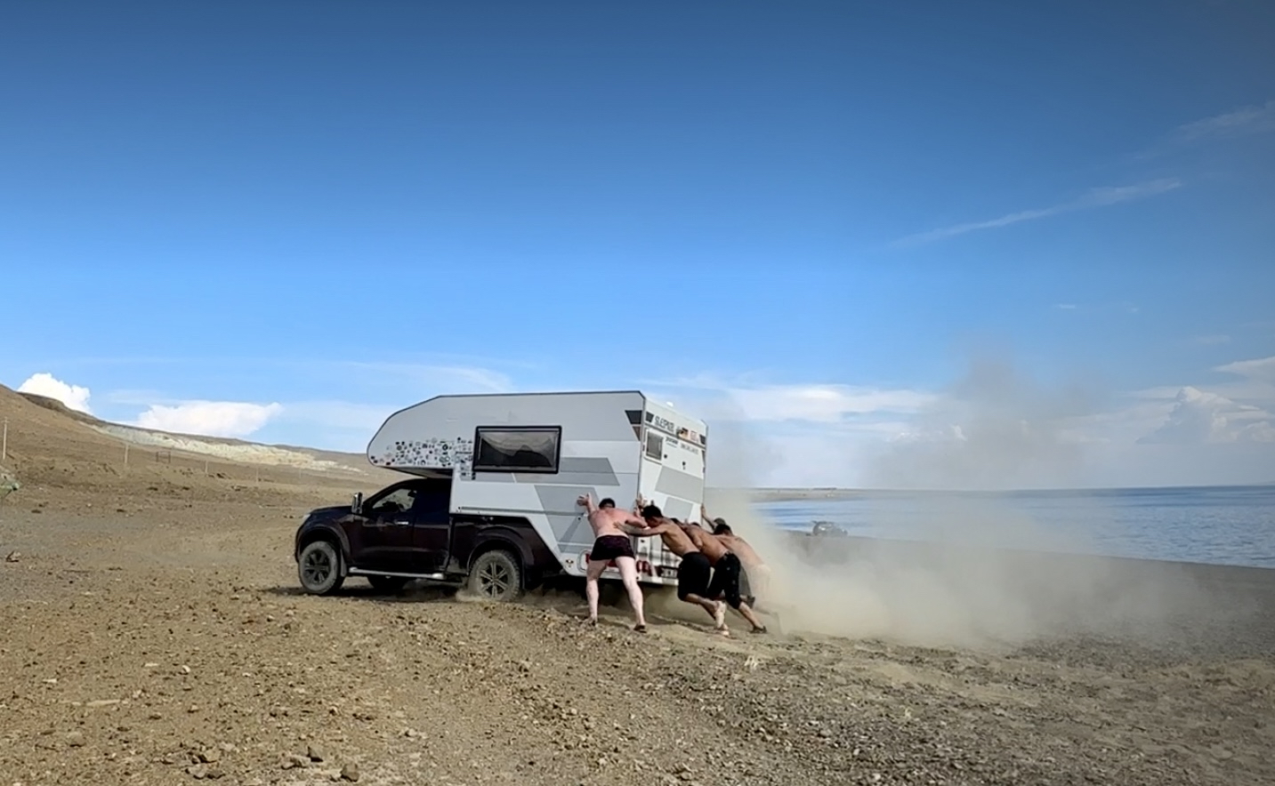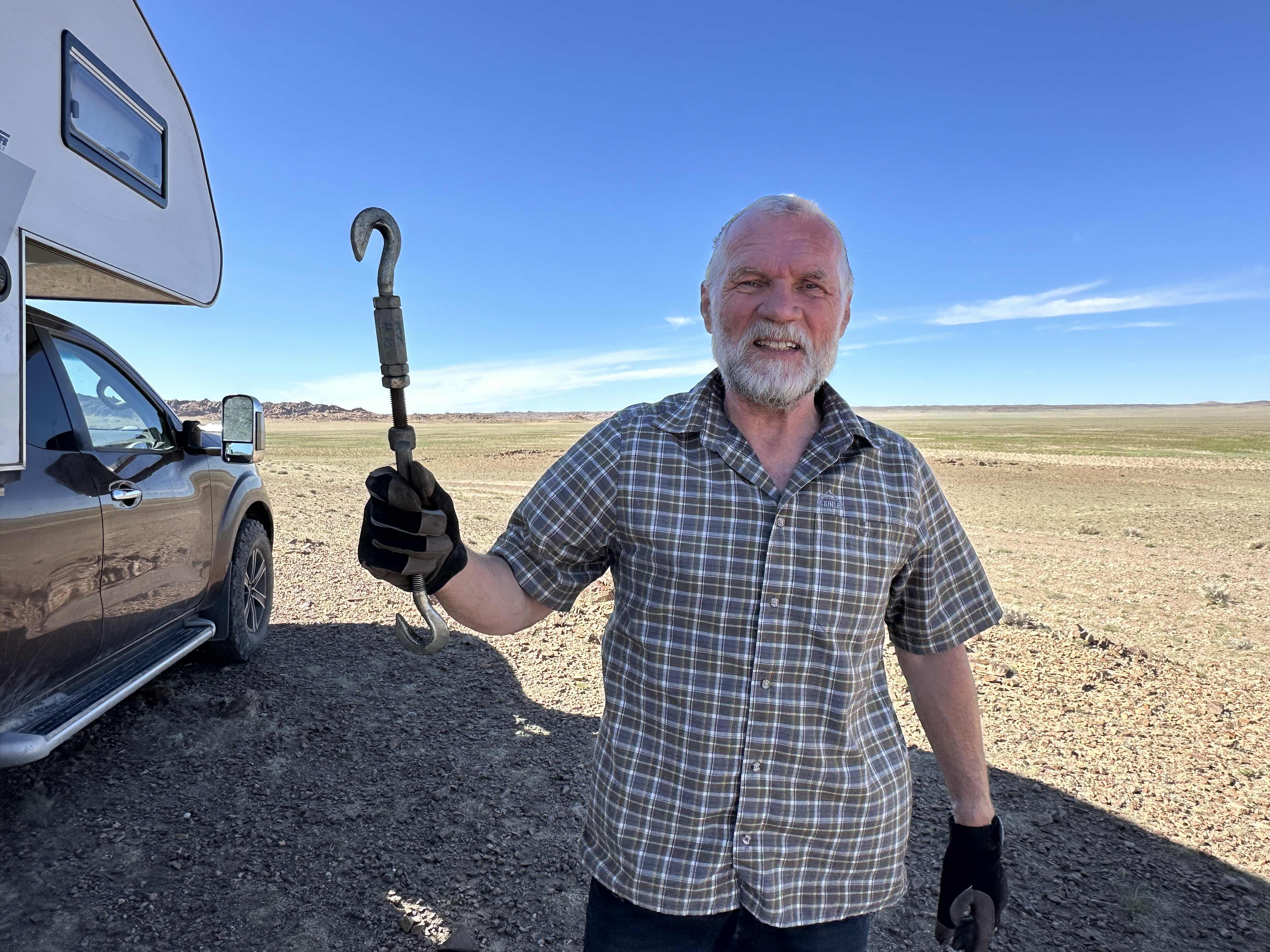 Wir fahren nun am Ufer des Khyargas Nuur entlang Es gibt sogar einen kleinen Sandstrand und wir fahren auf der Suche nach einem ruhigen Plätzchen weit an dem Strand entlang. Der Sand wird immer tiefer und nach einem kleinen Lenkfehler sitzen wir fest. Keine Chance, herauszufahren, die Sandbleche müssen her. Es ist ziemlich heiß und wir – eigentlich hauptsächlich Walter – rackern uns ab und kommen Meter für Meter voran. Inzwischen haben einige junge Männer wohl die Situation aus der Ferne beobachtet und kommen uns zu Hilfe. Sie schaufeln tüchtig mit und das letzte Stück schieben sie mit aller Kraft und wir haben wieder festen Boden unter den Rädern. Schon das 2. Mal an diesem Tag haben wir viel Hilfsbereitschaft und Freundlichkeit erlebt. Wir bedanken uns herzlich und geben den Helfern ein paar Dosen Bier für die abendliche Feier mit.