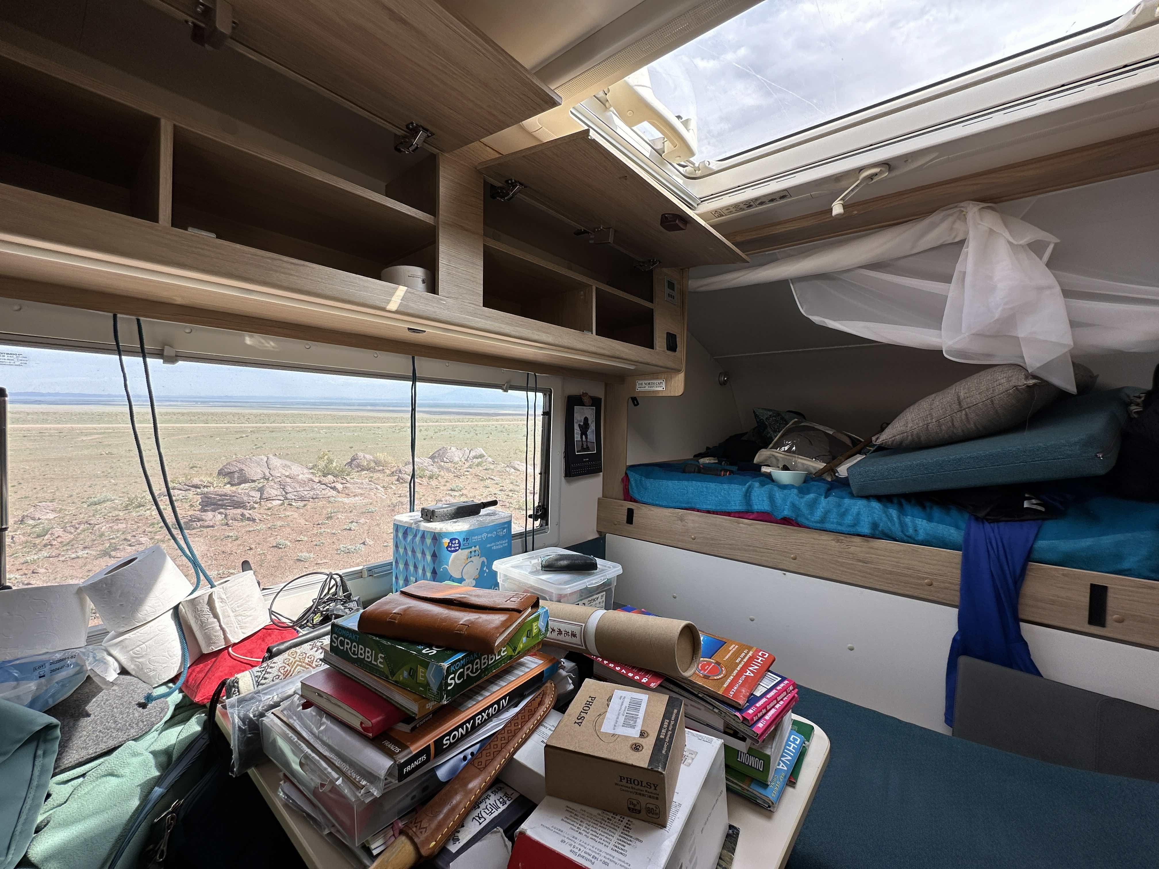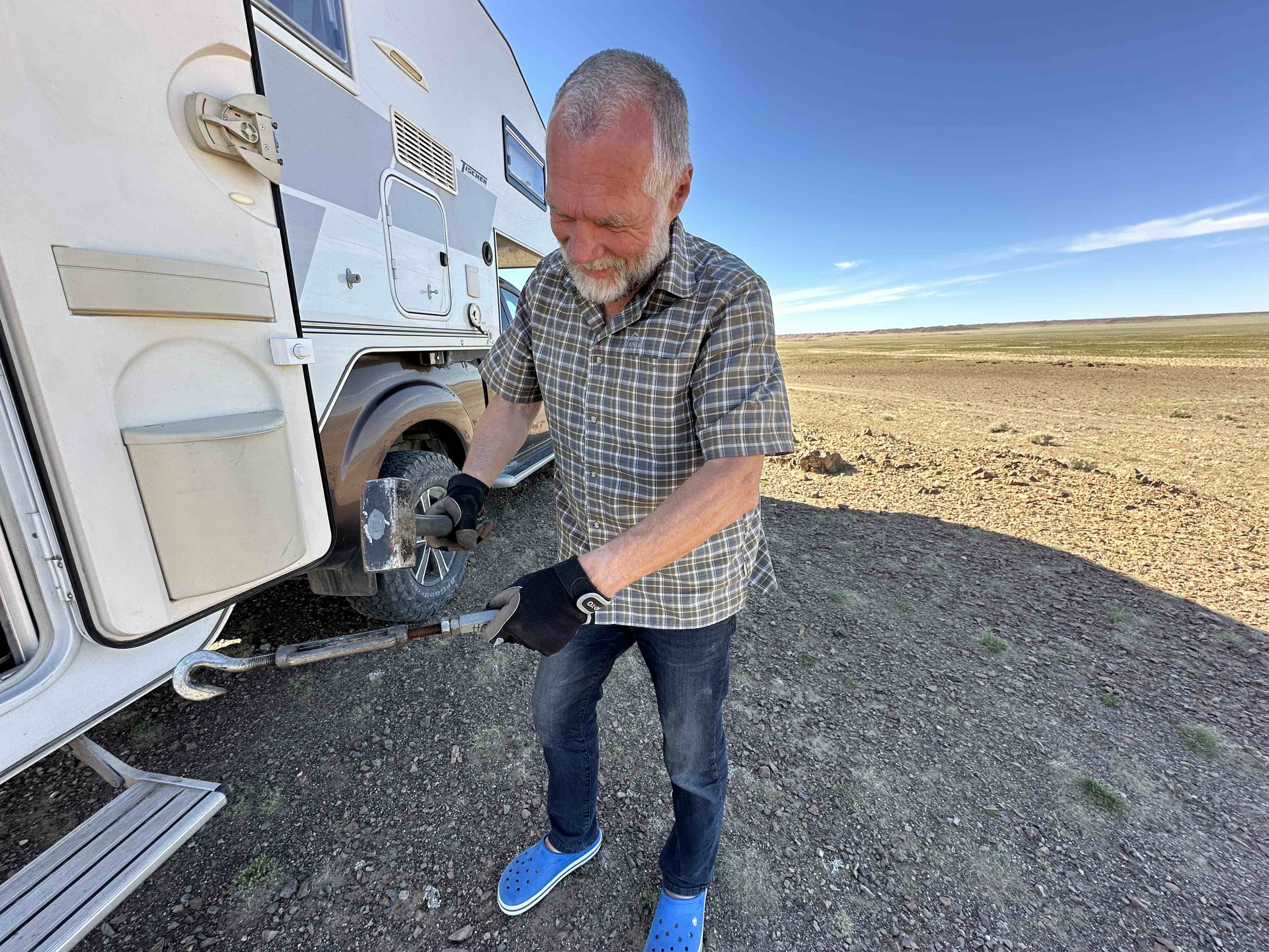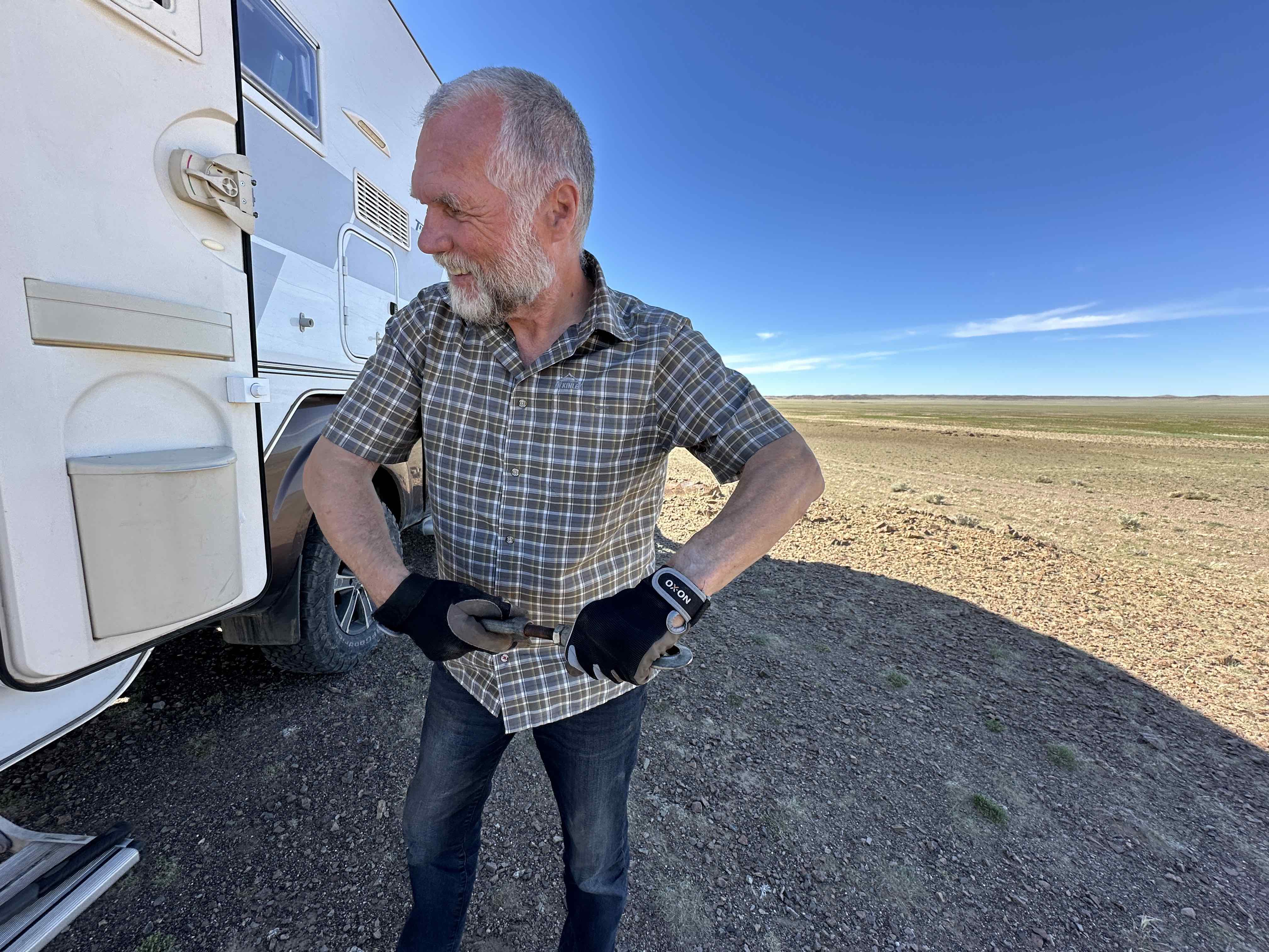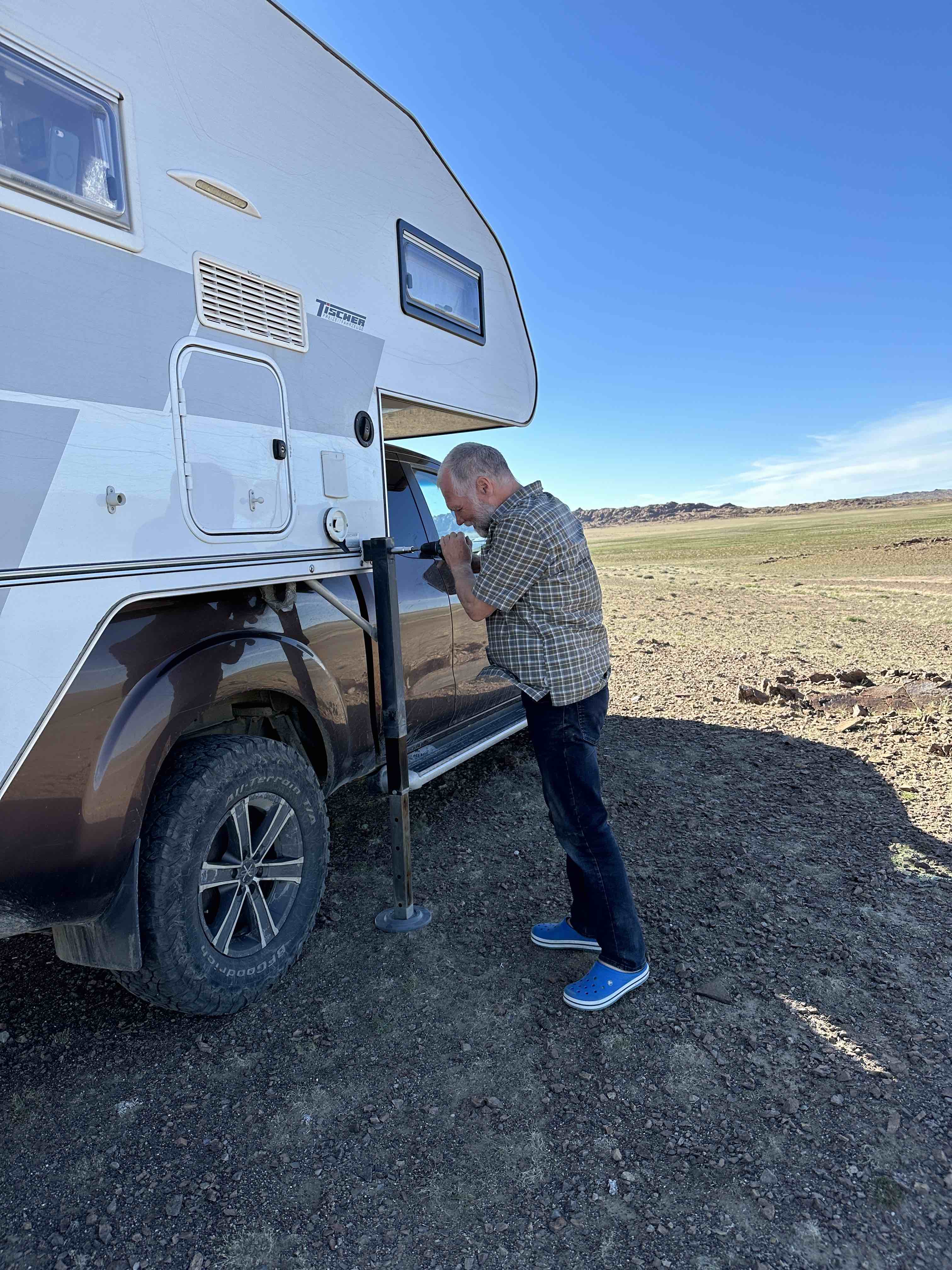 In Khovd finden wir einen kleinen Laden, in dem wir eine Handvoll Schrauben kaufen. Wir suchen uns ein schönes Plätzchen abseits der Straße, die eigentlich schon wieder eine Schotterpiste ist und Walter repariert den Schrank.