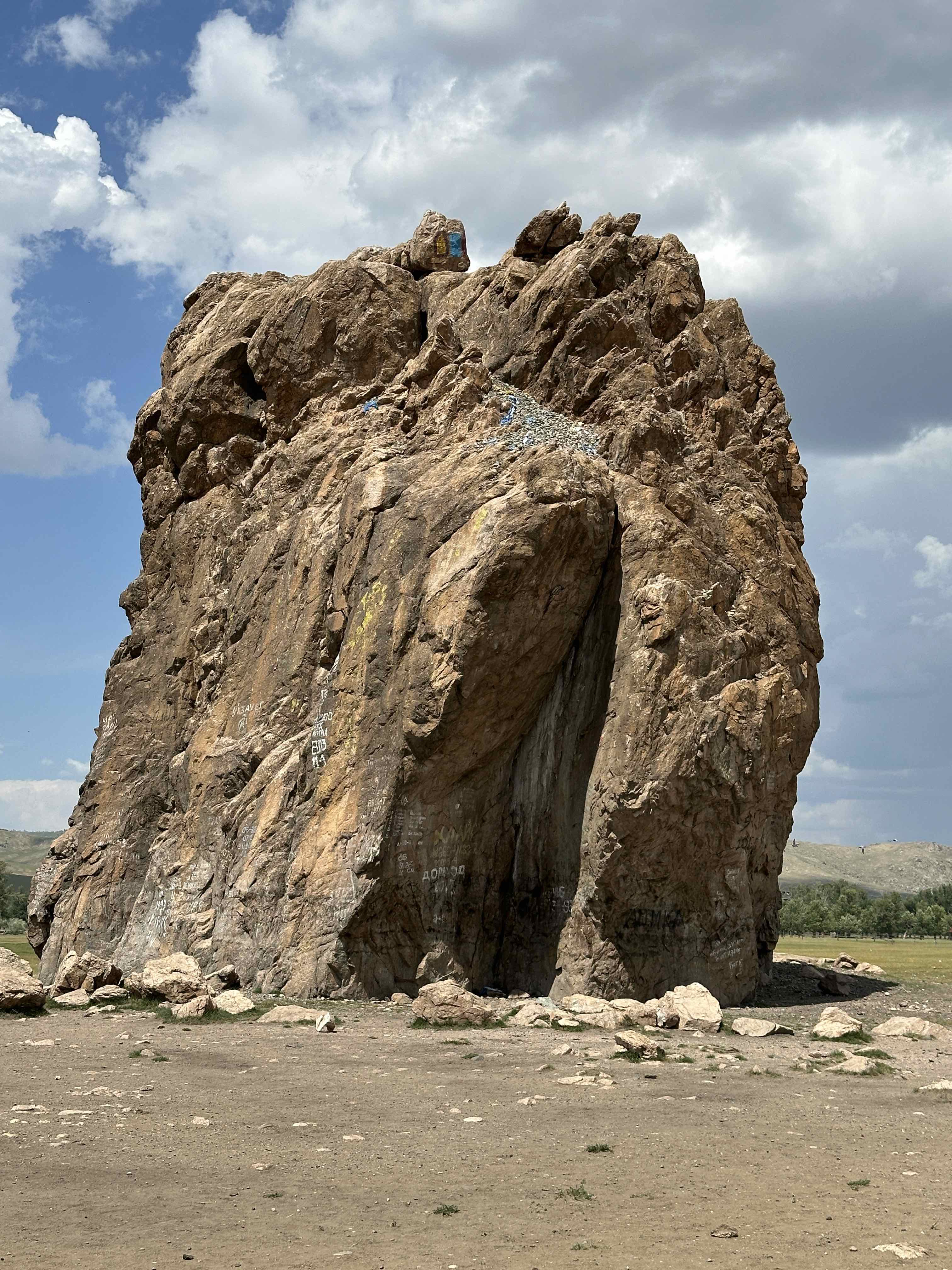 Auf unserem weiteren Weg besichtigen wir noch den Taikhaar Chulum, einen unvermittelt aus der Ebene emporragenden Felsen von 16 Meter Höhe. Es gibt viel Touristenrummel um den Stein herum, es wird behauptet, wenn man einen Stein auf ihn wirft, es Reichtum bescheren würde. Ich kann nicht so hoch werfen und begnüge mich damit, ihn am unteren Teil zu treffen, und hoffe das Beste!