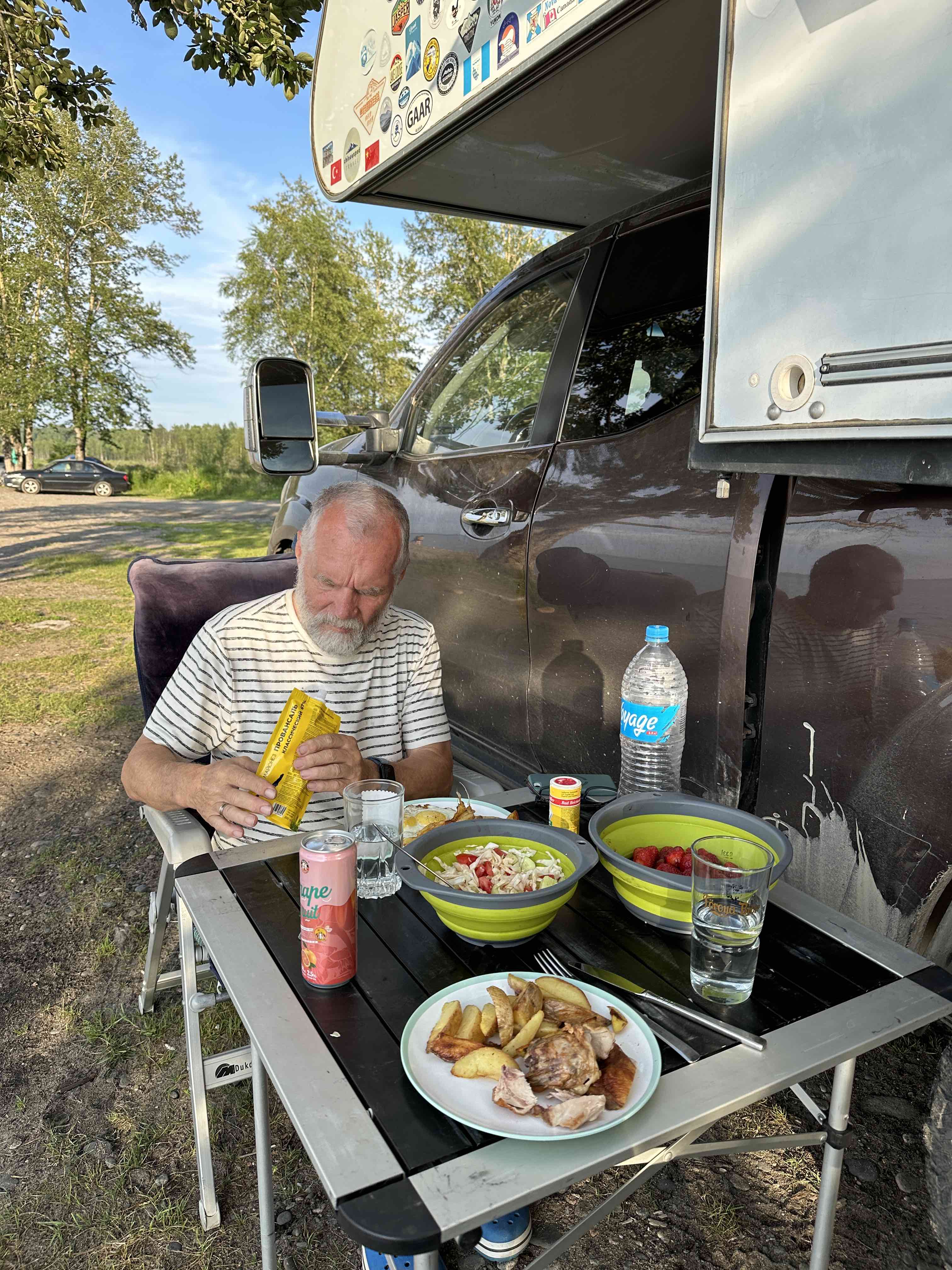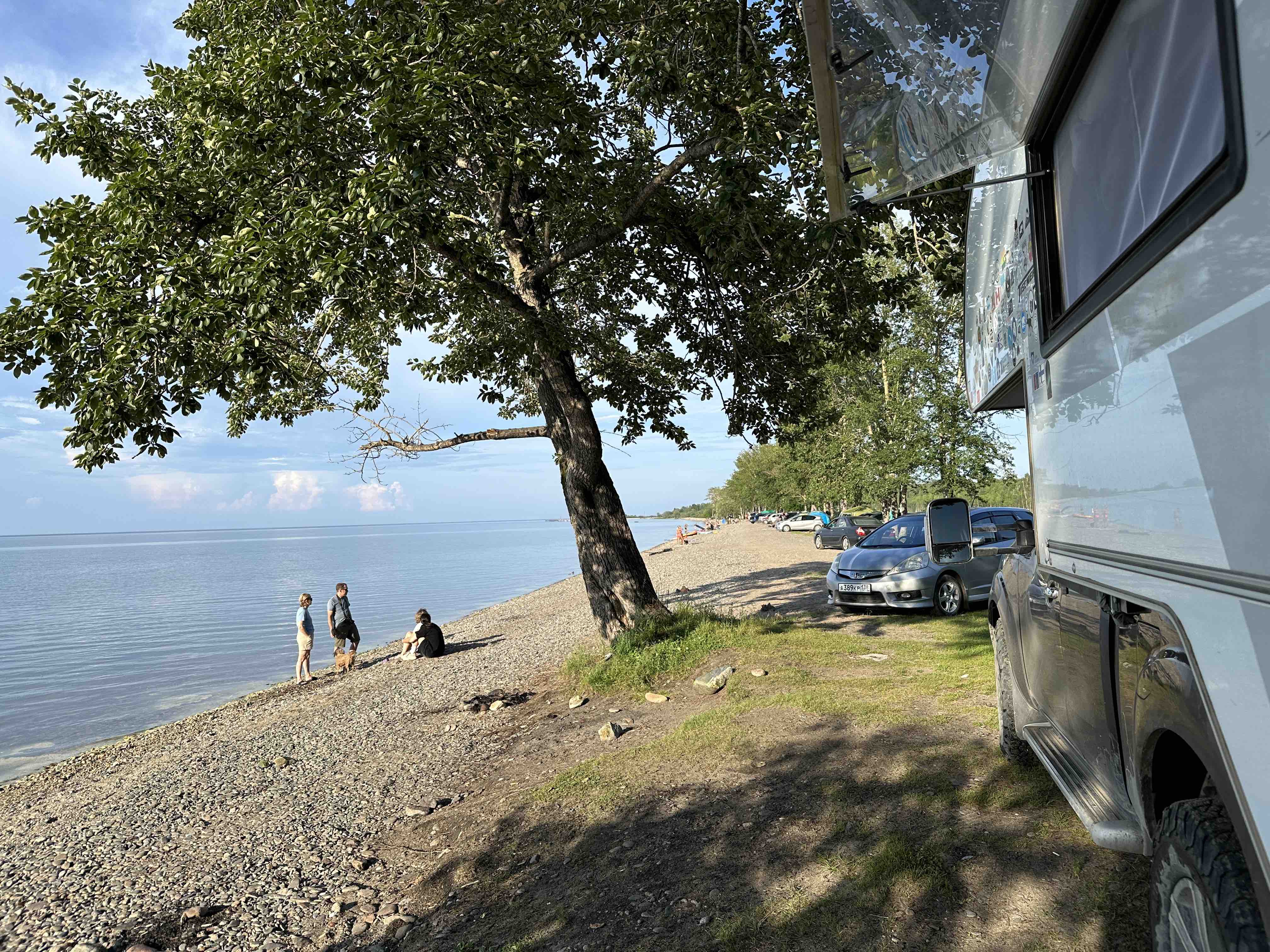 Am nächsten Tag fahren wir über Ulan Ude direkt an den Baikalsees. Der Weg dahin ist eine einzige Schlammpiste mit unzähligen riesigen Löchern. Der Platz ist trotzdem sehr beliebt und etliche Familien haben am Seeufer ihre Zelte aufgebaut. Wir finden auch noch einen freien Platz und genießen unseren Nachtisch aus sibirischen Erdbeeren.