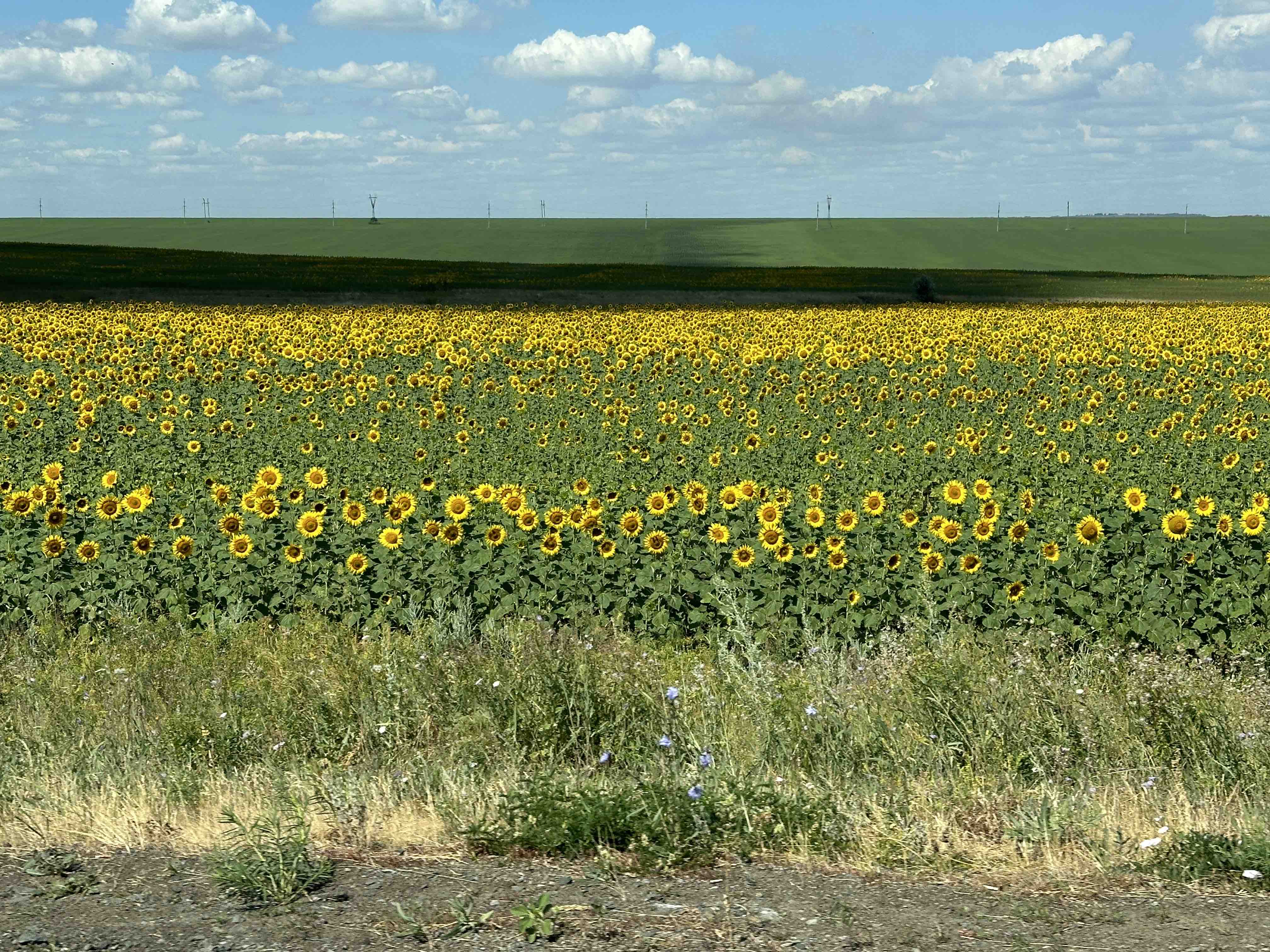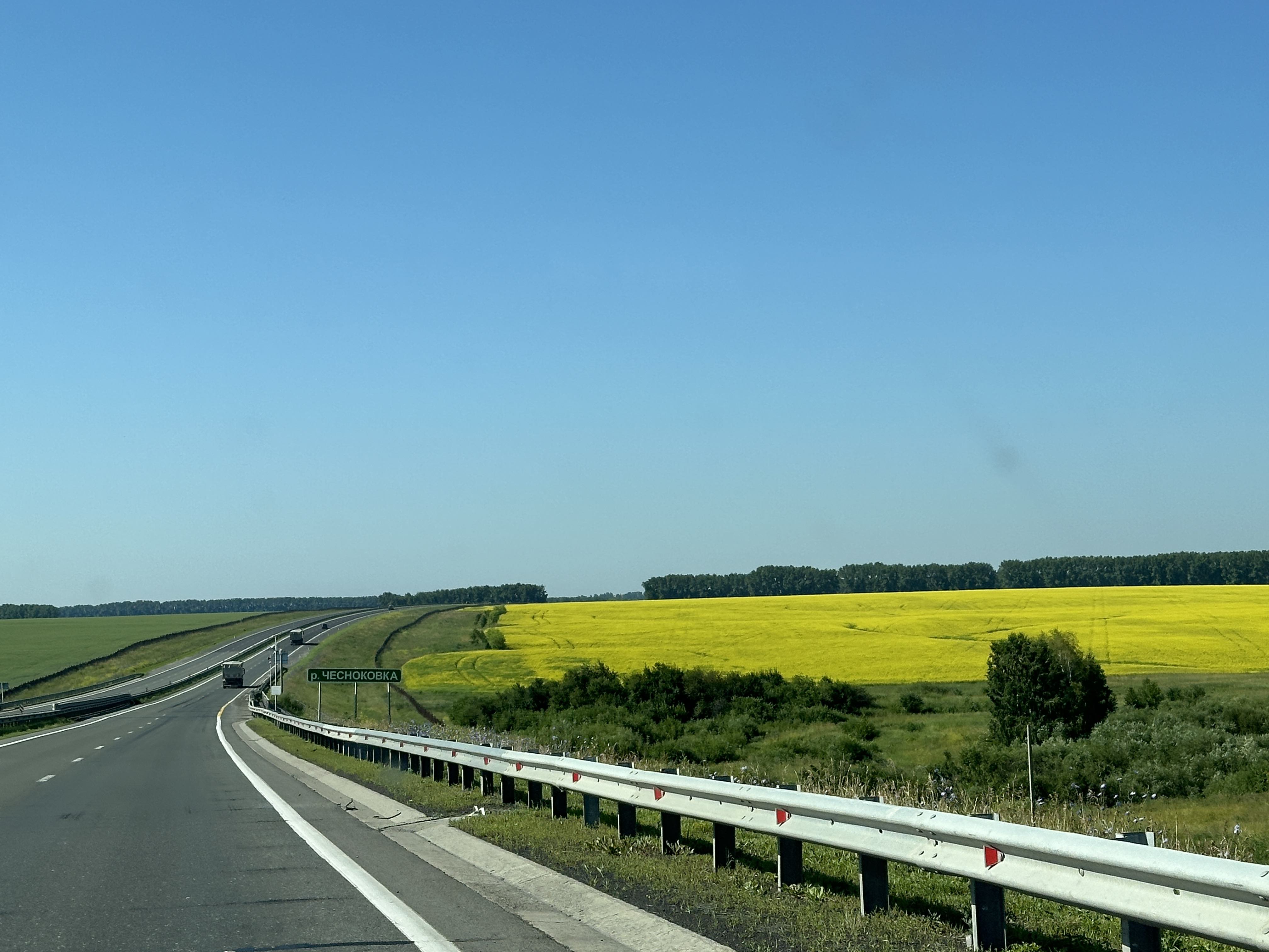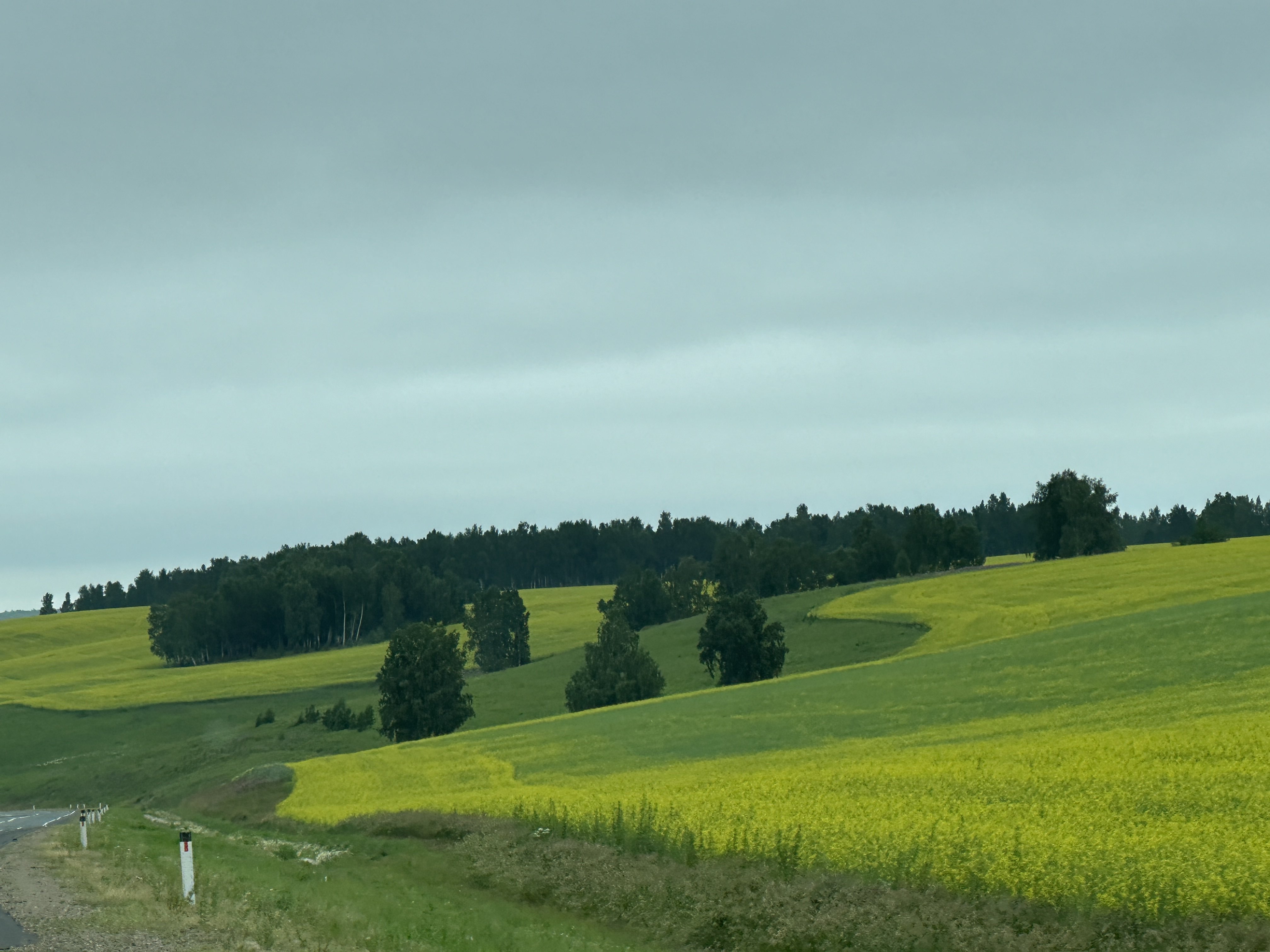 Wir fahren noch ein ganzes Stück am See entlang und westlich an Irtusk vorbei. Unterwegs sind die Straßen gesäumt von riesigen strahlend gelben Rapsfeldern, Sonnenblumenfeldern, blauen Flachsfeldern, blühenden Wiesen und Wäldern.